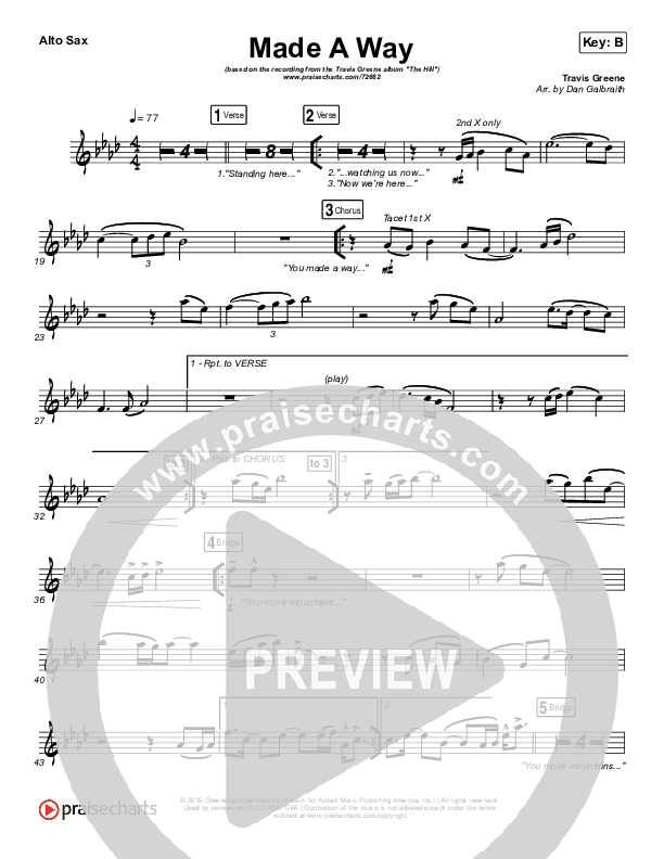 Download the AltoSax sheet music for Made A Way by Travis Greene, from the album The Hill. This song was arranged by Daniel Galbraith in the key of B, Bb.
