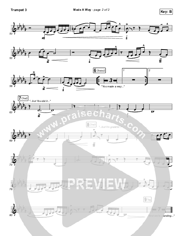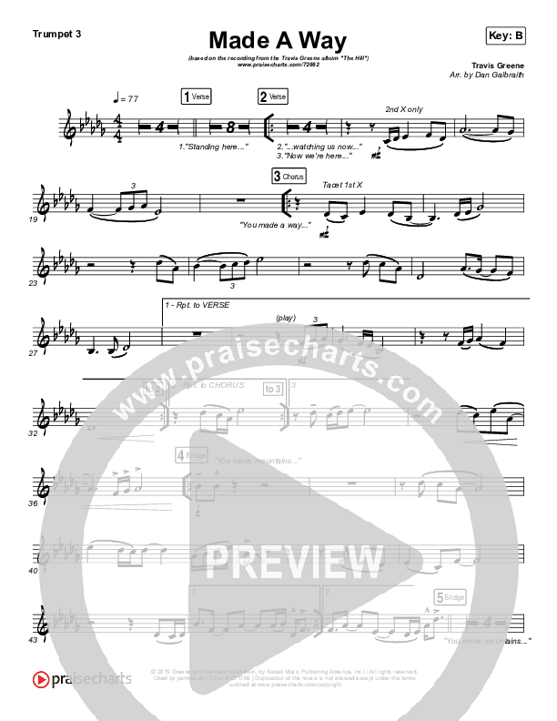 Download the Trumpet 3 sheet music for Made A Way by Travis Greene, from the album The Hill. This song was arranged by Daniel Galbraith in the key of B, Bb.