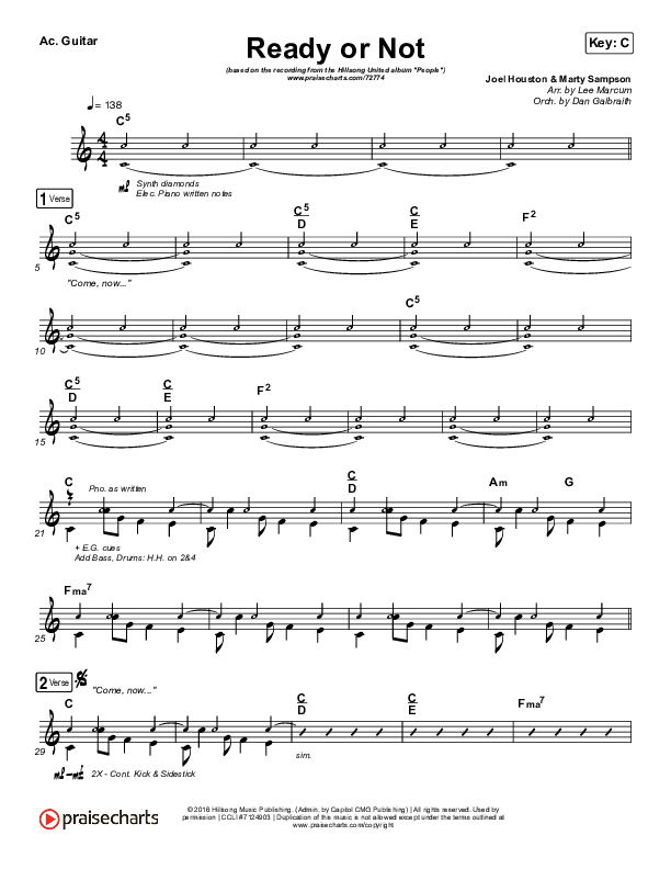 Download the Acoustic Guitar sheet music for Ready Or Not by Hillsong UNITED, from the album People. This song was arranged by Lee Marcum / Daniel Galbraith in the key of Bb, C.