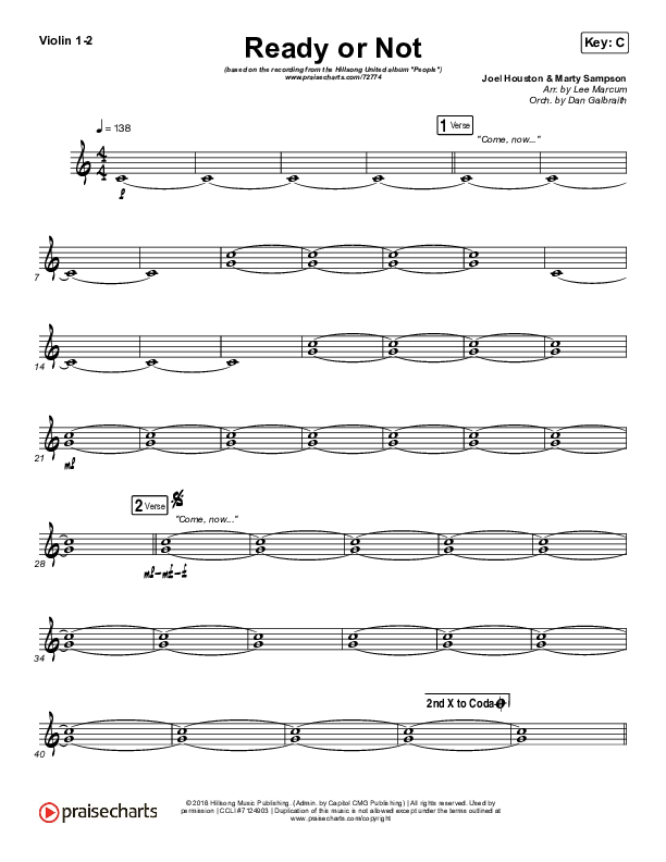 Download the Violin sheet music for Ready Or Not by Hillsong UNITED, from the album People. This song was arranged by Lee Marcum / Daniel Galbraith in the key of Bb, C.