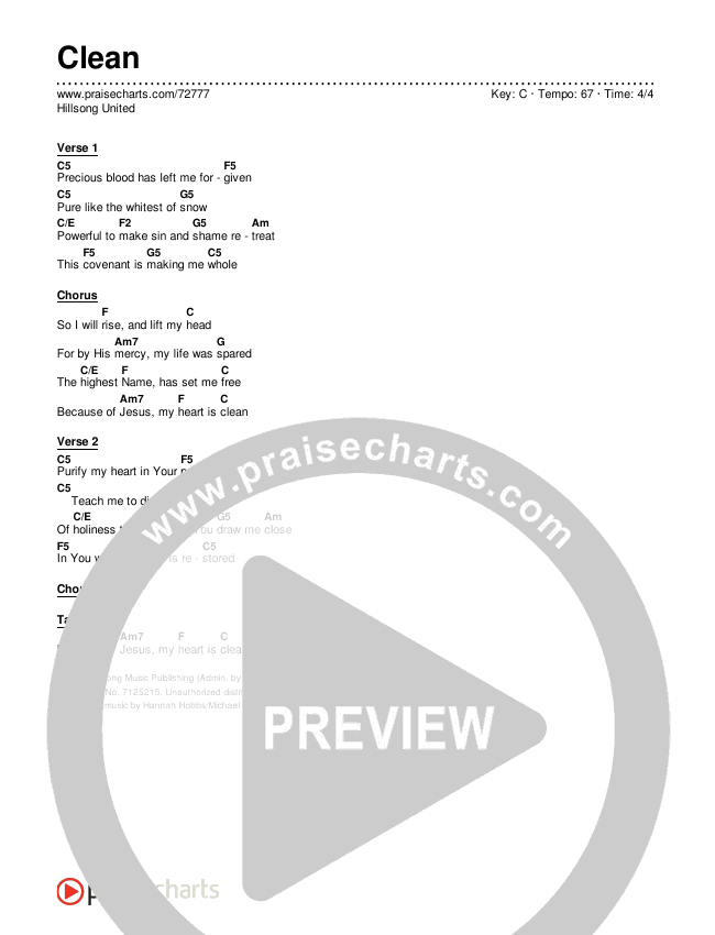 Download the PDF Chord Charts for Clean by Hillsong UNITED, from the album People. This song was arranged by Grant Wall / Daniel Galbraith in the key of C, D.