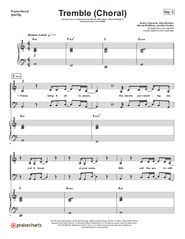 Download the sheet music for Tremble (Choral Anthem SATB) by Mosaic MSC / Arr. Luke Gambill, from the album Glory & Wonder. This song was arranged by Luke Gambill / Daniel Galbraith in the key of C.