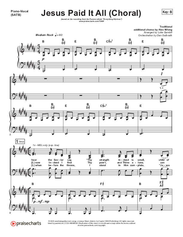 Download the sheet music for Jesus Paid It All (Choral Anthem SATB) by Passion / Kristian Stanfill / Arr. Luke Gambill, from the album Passion: Everything Glorious. This song was arranged by Luke Gambill / Daniel Galbraith in the key of B.