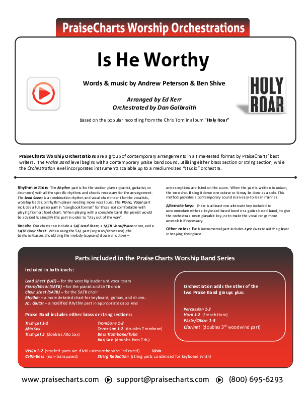 Download the Orchestration for Is He Worthy by Chris Tomlin, from the album Holy Roar. This song was arranged by Ed Kerr / Daniel Galbraith in the key of C, D, E, Eb.
