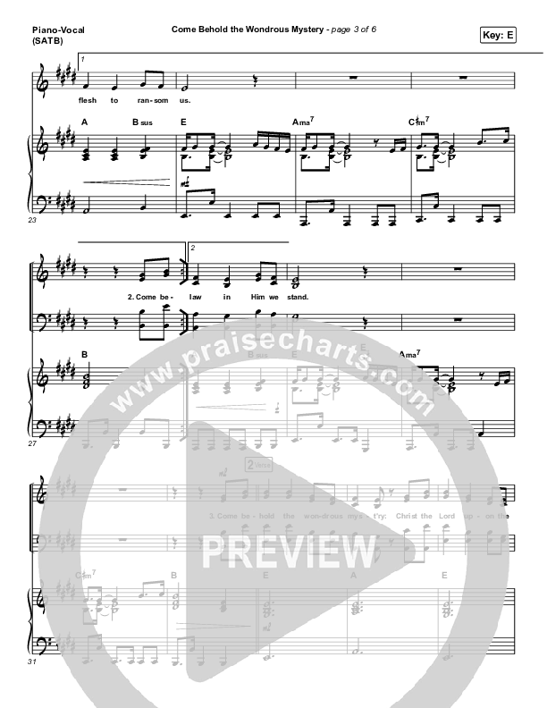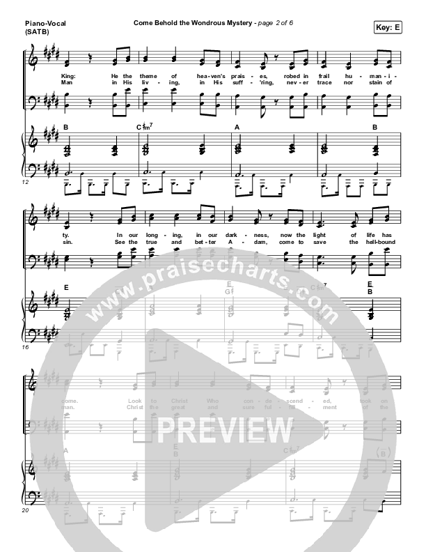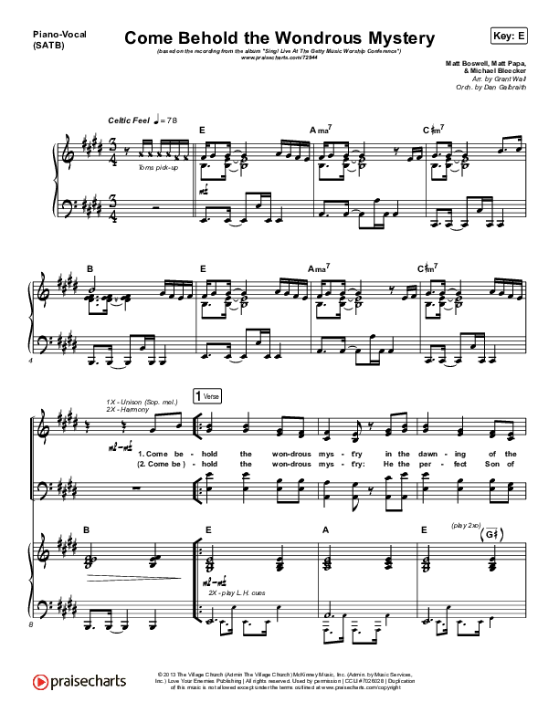 Download the sheet music for Come Behold The Wondrous Mystery by Keith & Kristyn Getty, from the album Sing! Live At The Getty Music Worship Conference. This song was arranged by Grant Wall in the key of E, Eb.