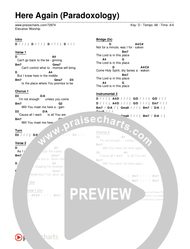 Download the PDF Chord Charts for Here Again (Paradoxology) by Elevation Worship, from the album Paradoxology. This song was arranged by Jeff Moore in the key of C, D.