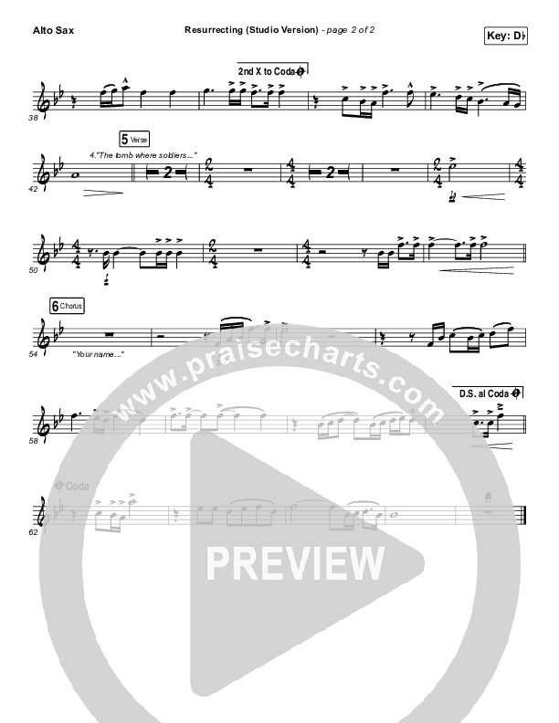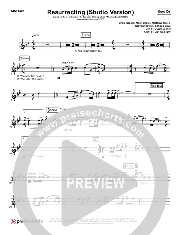 Download the AltoSax sheet music for Resurrecting (Studio) by Elevation Worship, from the album Resurrecting EP. This song was arranged by Dustin Loehrs / Daniel Galbraith in the key of D, Db.