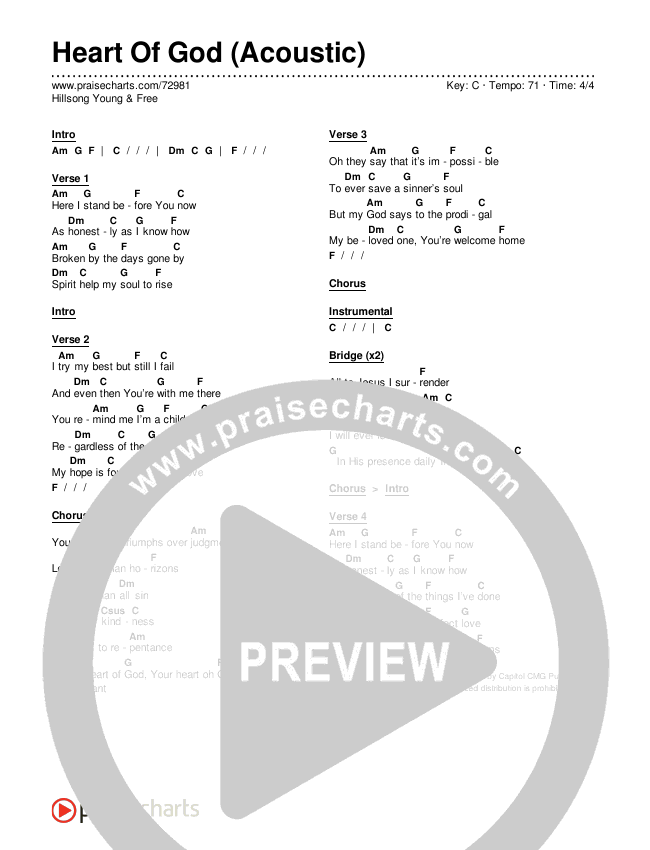 Download the PDF Chord Charts for Heart Of God (Acoustic) by Hillsong Young & Free, from the album lll (Studio Sessions).