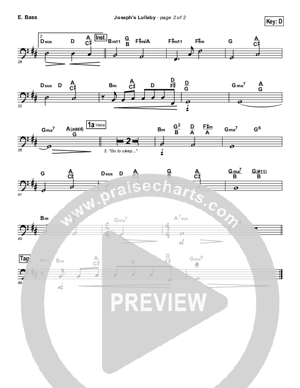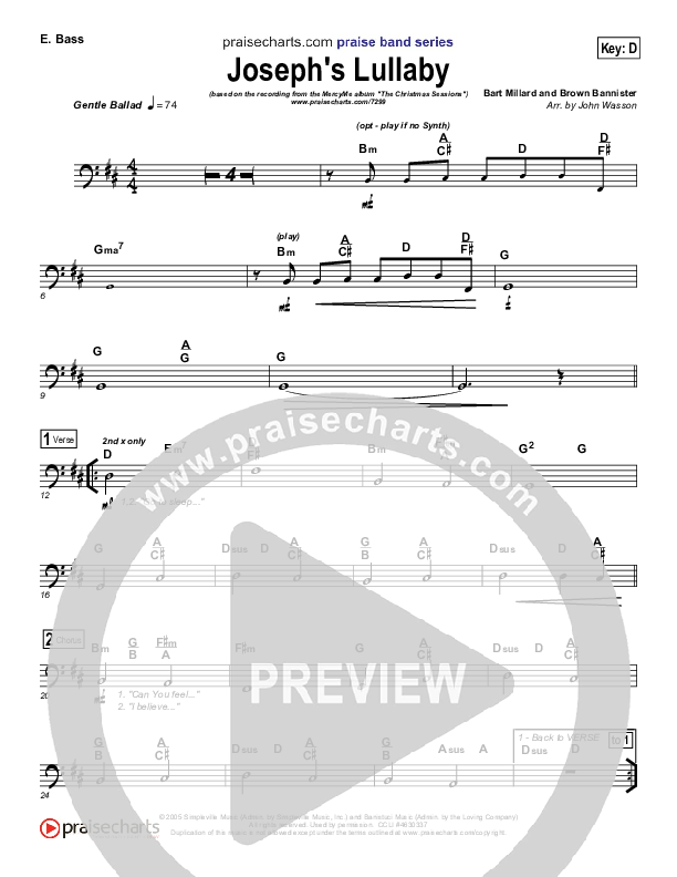 Download the Bass Guitar parts for Joseph's Lullaby by MercyMe, from the album The Christmas Sessions. This song was arranged by John Wasson in the key of D, Eb.