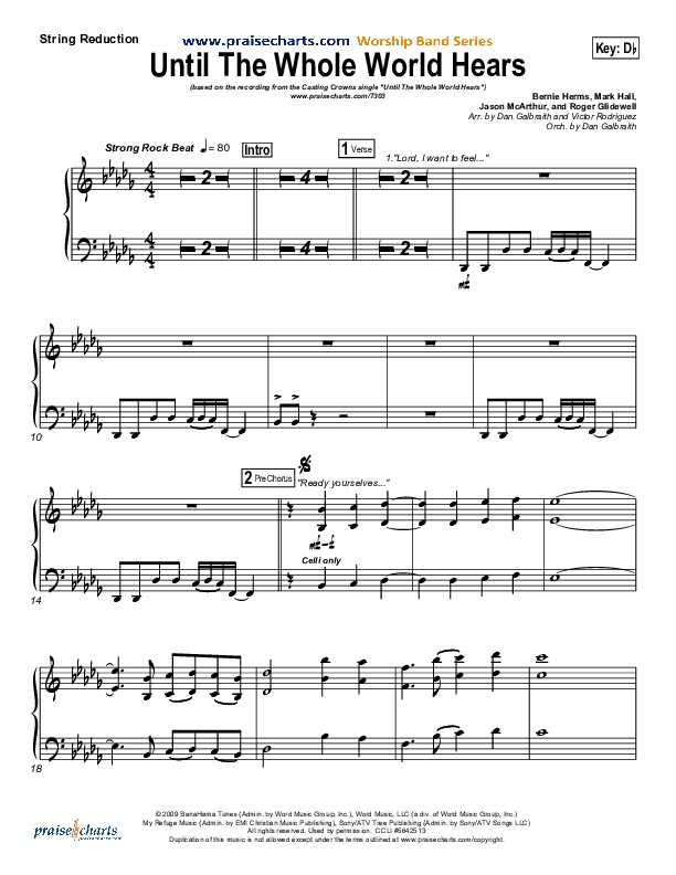 Download the Orchestration for Until The Whole World Hears by Casting Crowns, from the album Until The Whole World Hears. This song was arranged by Daniel Galbraith / Victor Rodriguez in the key of C, Db.