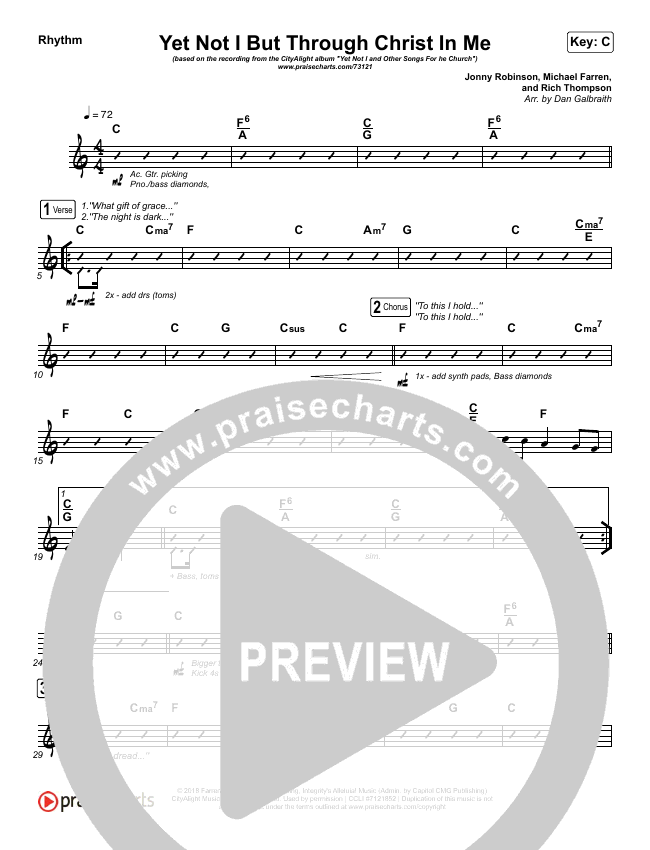 Download the Rhythm Chart for Yet Not I But Through Christ In Me by CityAlight, from the album Yet Not I. This song was arranged by Daniel Galbraith in the key of C, D.