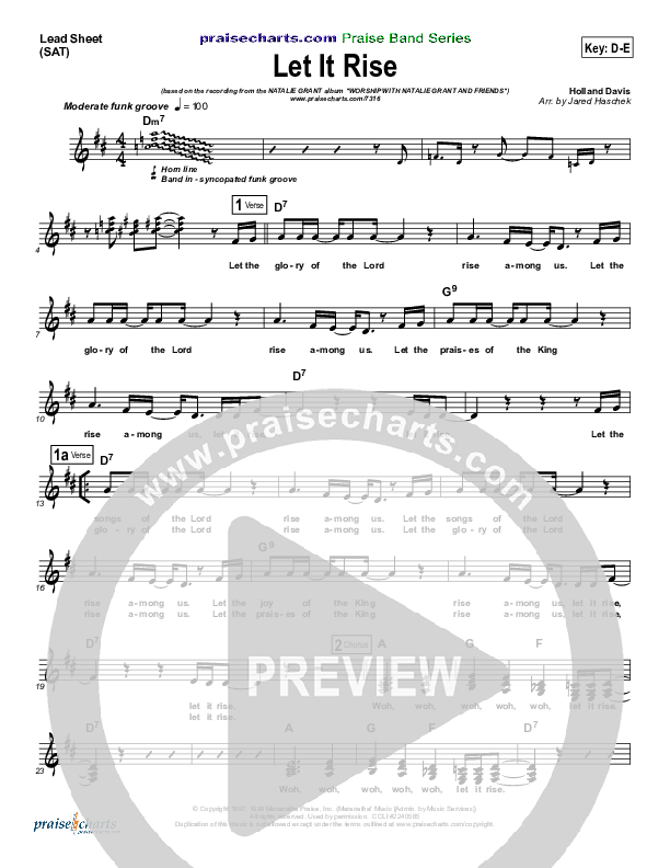 Download the sheet music for Let It Rise by Natalie Grant, from the album Worship With Natalie Grant and Friends. This song was arranged by Jared Haschek in the key of D, Eb.