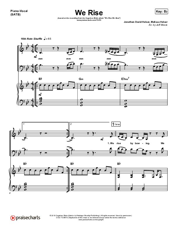 Download the sheet music for We Rise by Cageless Birds, from the album We Rise We Bow. This song was arranged by Jeff Moore in the key of A, Bb.