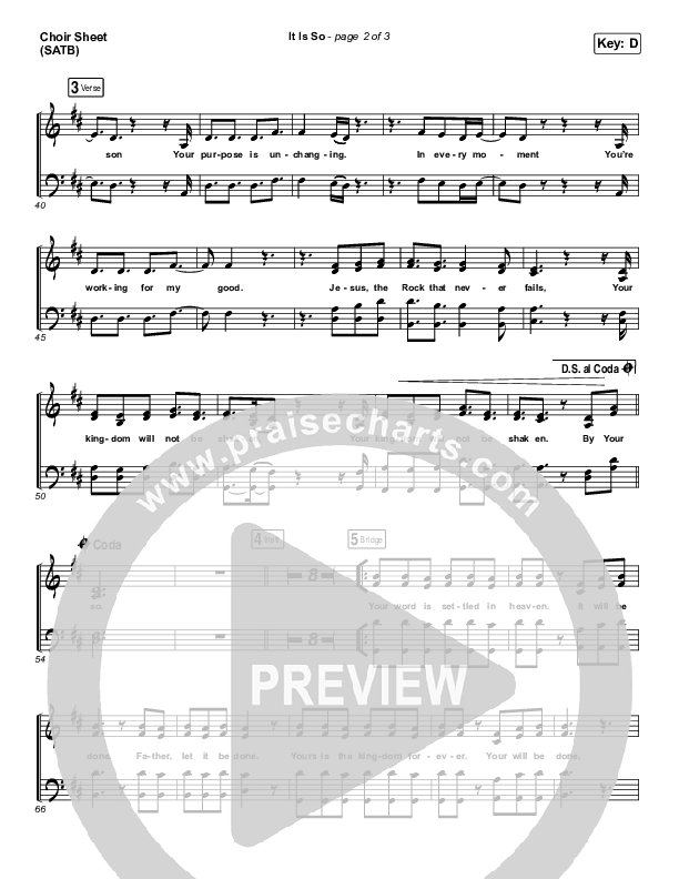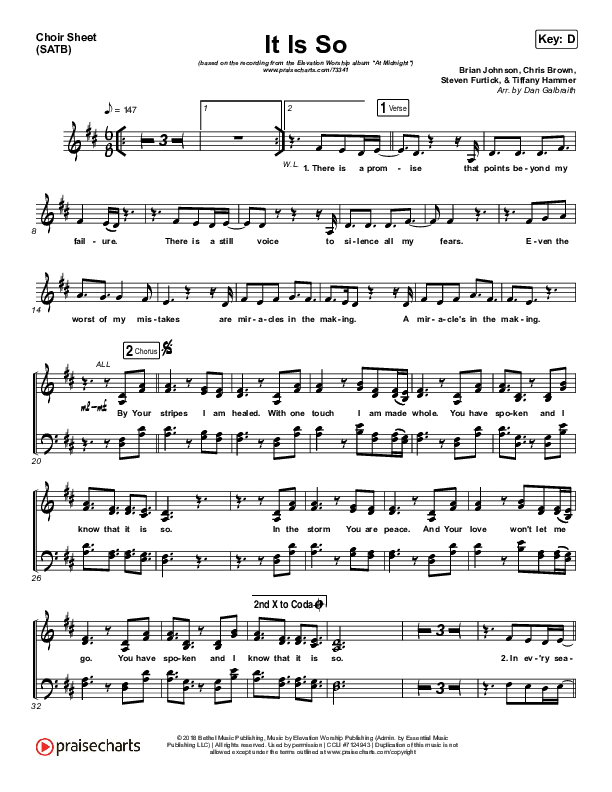 Download the Choir Sheet for It Is So by Elevation Worship, from the album At Midnight. This song was arranged by Daniel Galbraith in the key of D, Eb.