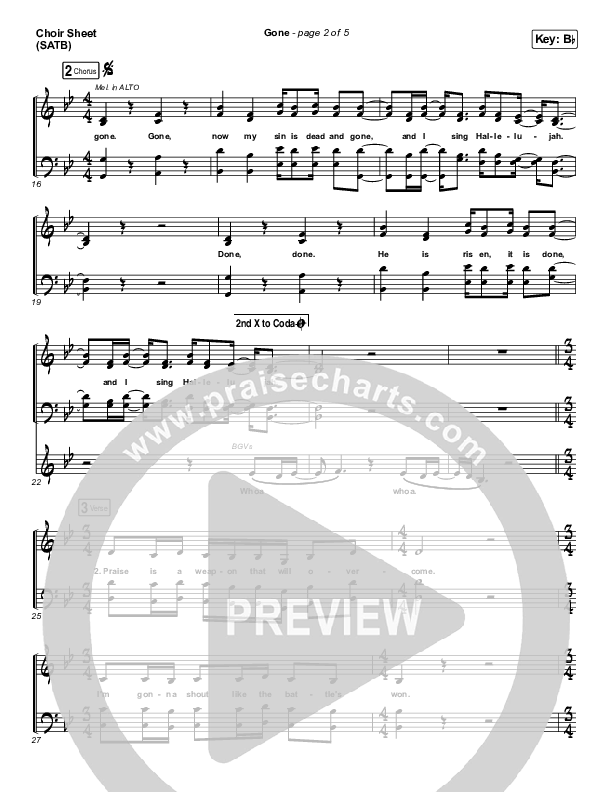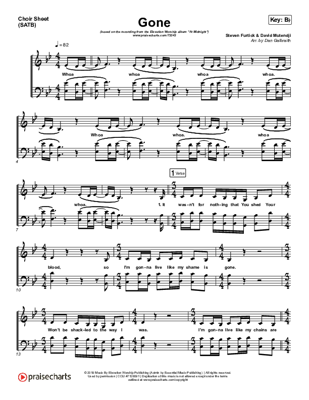 Download the Choir Sheet for Gone by Elevation Worship, from the album At Midnight. This song was arranged by Daniel Galbraith in the key of A, Bb, E, Eb, F, G.