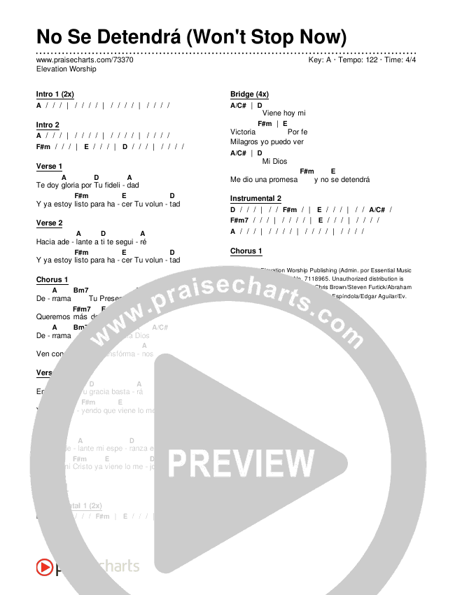 Download the PDF Chord Charts for No Se Detendra (Won't Stop Now) by Elevation Worship, from the album Aleluya (En La Tierra).