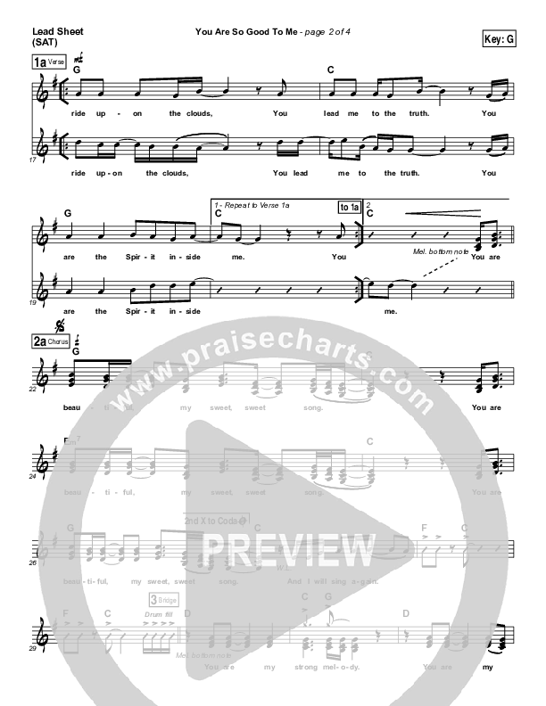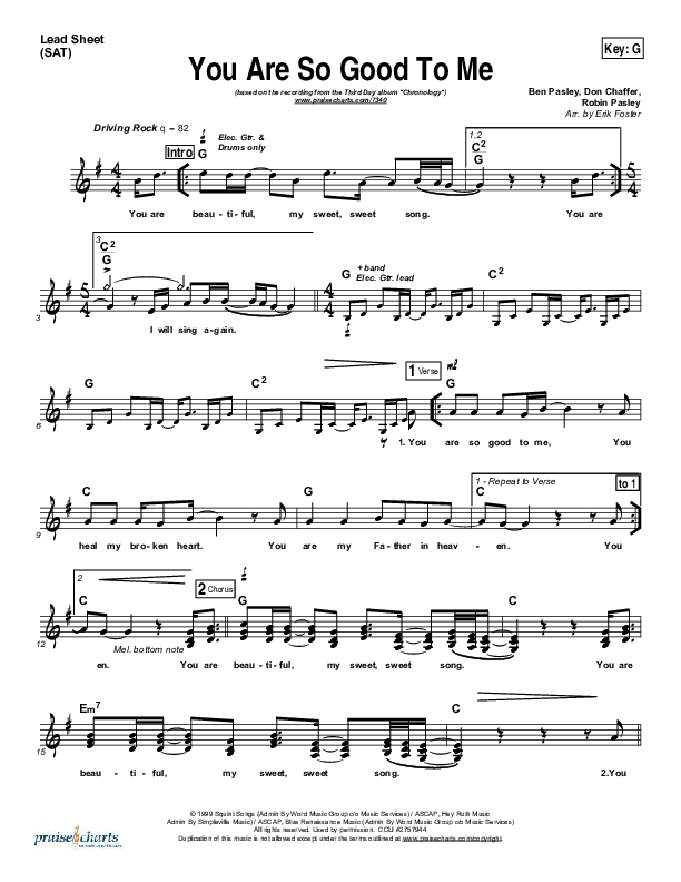 Download the sheet music for You Are So Good To Me by Third Day, from the album Chronology Vol 2. This song was arranged by Erik Foster in the key of F, G.