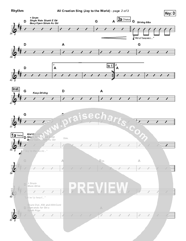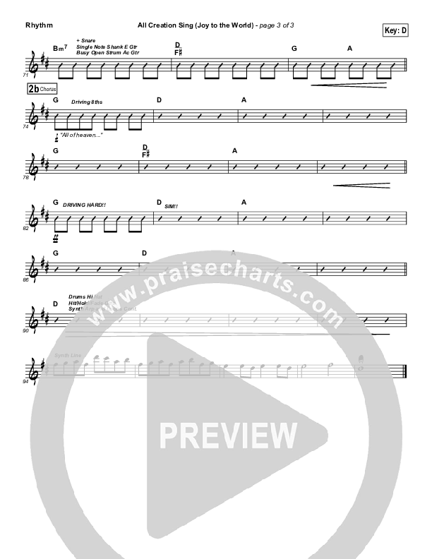 Download the Rhythm Chart for All Creation Sing (Joy To The World) by FEE Band, from the album All Creation Sing. This song was arranged by Brad Henderson / Daniel Semsen in the key of C, D.