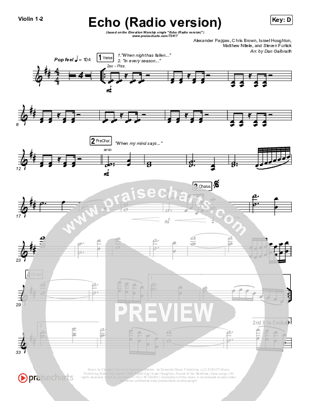 Download the Violin sheet music for Echo (Radio) by Elevation Worship, from the album Echo - Radio Version. This song was arranged by Daniel Galbraith in the key of C, D.