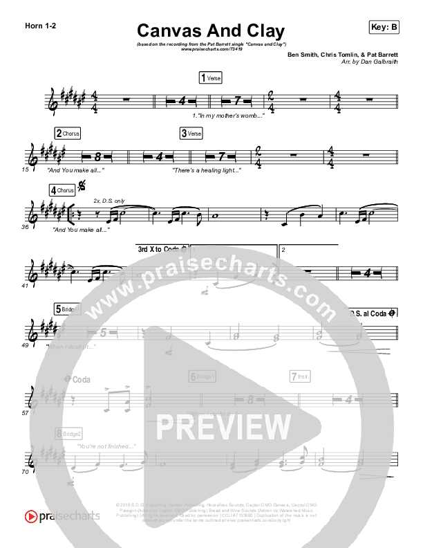Download the Orchestration brass parts for Canvas And Clay (Live) by Pat Barrett, from the album Canvas And Clay (Live). This song was arranged by Daniel Galbraith in the key of B, Bb.