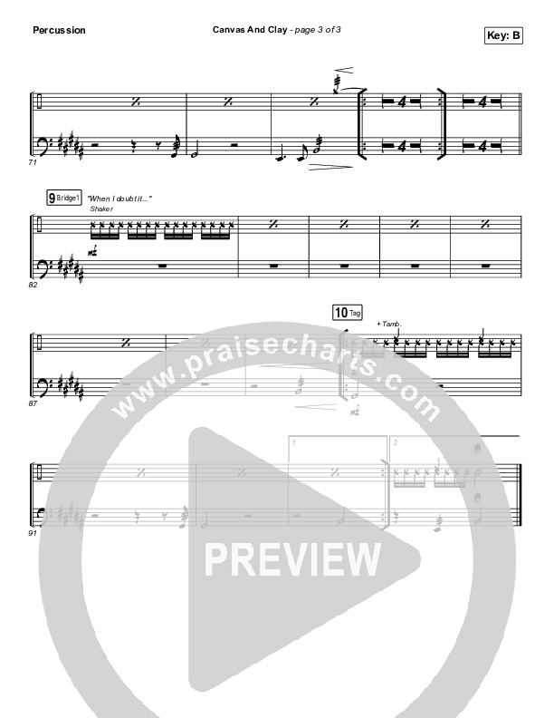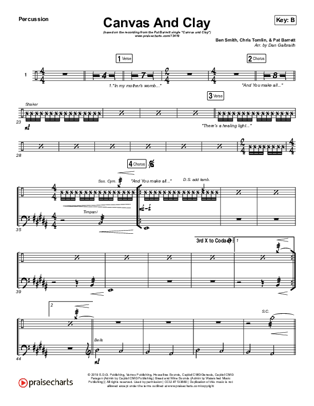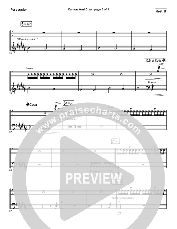 Download the percussion sheet music for Canvas And Clay (Live) by Pat Barrett, from the album Canvas And Clay (Live). This song was arranged by Daniel Galbraith in the key of B, Bb.