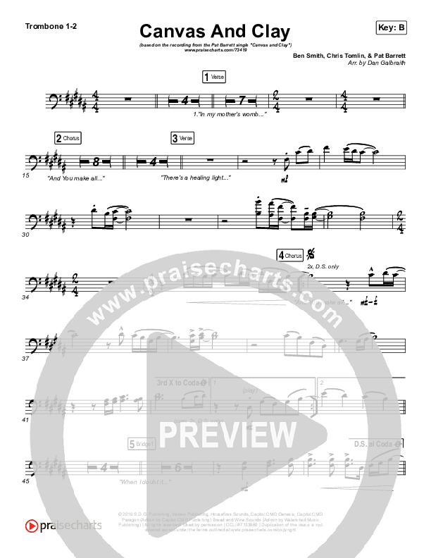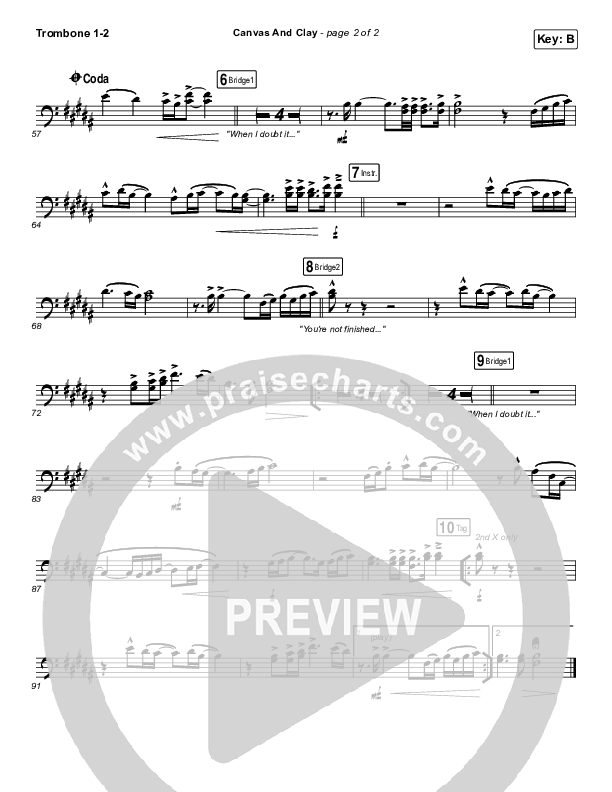 Download the Trombone 1,2 sheet music for Canvas And Clay (Live) by Pat Barrett, from the album Canvas And Clay (Live). This song was arranged by Daniel Galbraith in the key of B, Bb.