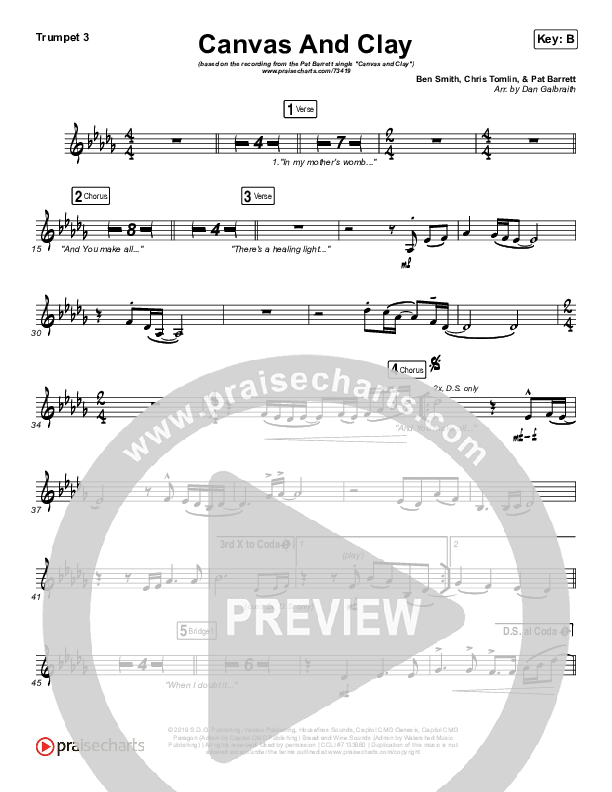Download the Trumpet 3 sheet music for Canvas And Clay (Live) by Pat Barrett, from the album Canvas And Clay (Live). This song was arranged by Daniel Galbraith in the key of B, Bb.