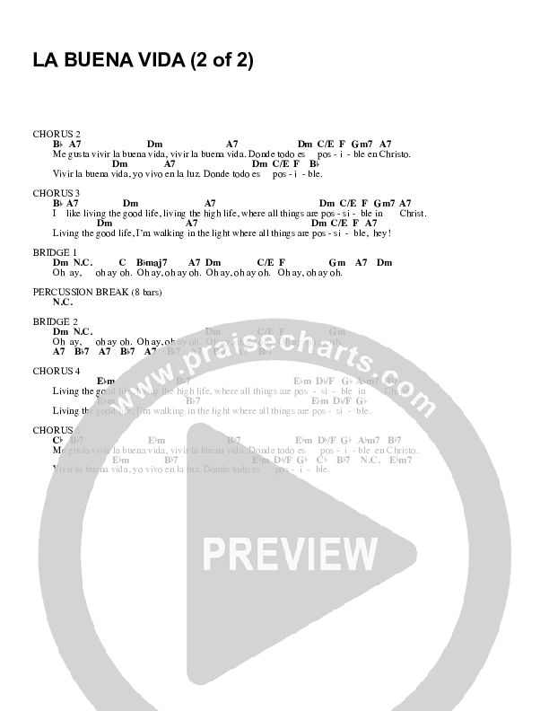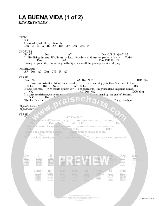 Download the PDF Chord Charts for La Buena Vida by Ken Reynolds, from the album One World One God. This song was arranged by Integrity Music in the key of F.