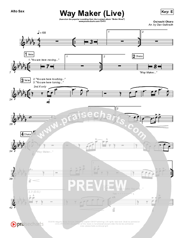 Download the AltoSax sheet music for Way Maker (Live) by Leeland, from the album Better Word. This song was arranged by Daniel Galbraith in the key of Bb, C, D, Db, E, Eb, G.