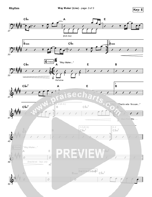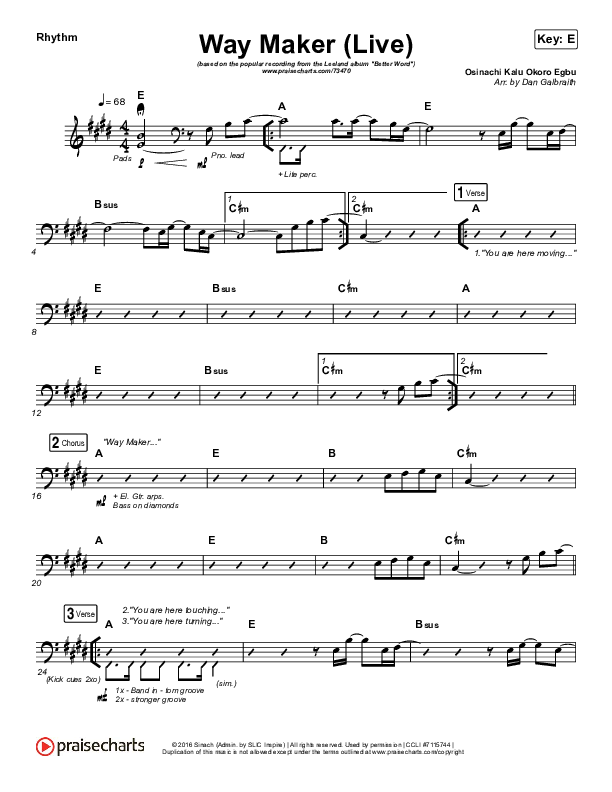 Download the Rhythm Chart for Way Maker (Live) by Leeland, from the album Better Word. This song was arranged by Daniel Galbraith in the key of Bb, C, D, Db, E, Eb, G.