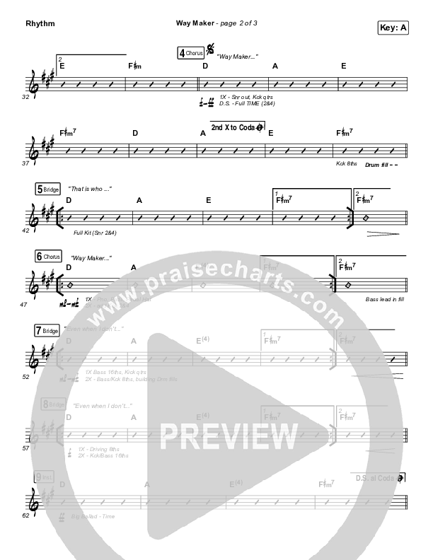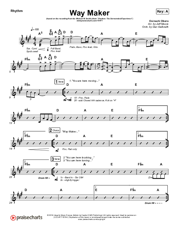Download the Rhythm Chart for Way Maker (Live) by Michael W. Smith, from the album Awaken: The Surrounded Experience. This song was arranged by Jeff Moore in the key of A, Ab, Bb.