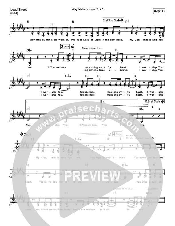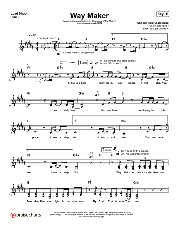 Download the sheet music for Way Maker by Sinach, from the album Way Maker - Single. This song was arranged by Erik Foster / Daniel Galbraith in the key of B, C.