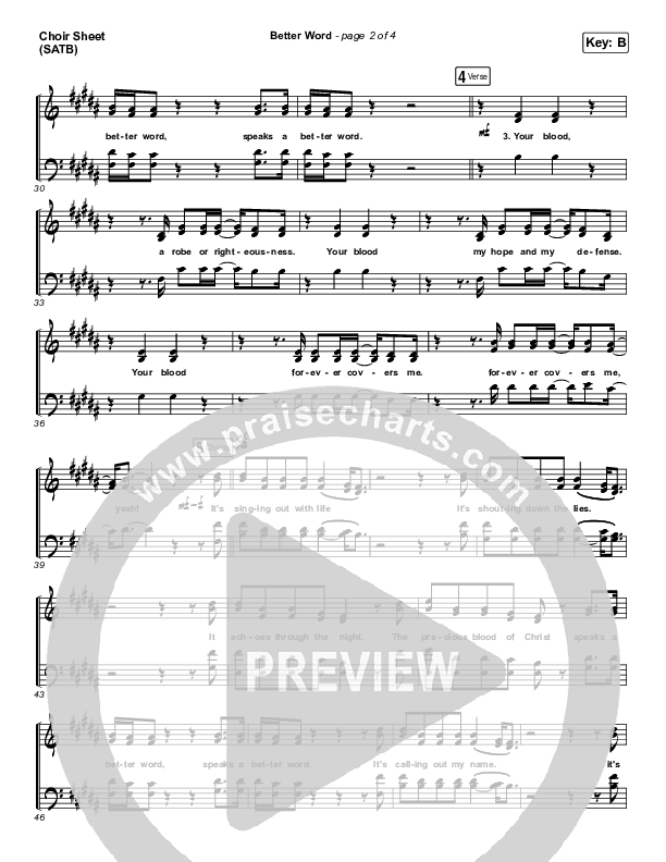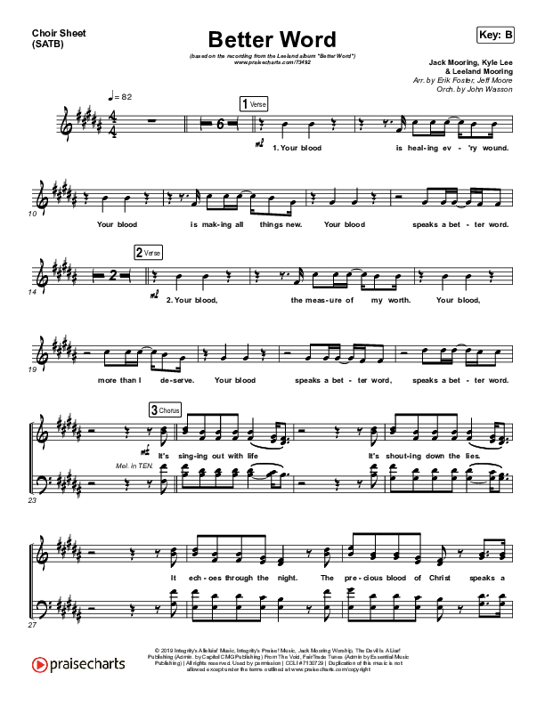 Download the Choir Sheet for Better Word (Live) by Leeland, from the album Better Word. This song was arranged by Erik Foster / Jeff Moore / John Wasson in the key of B, Bb.