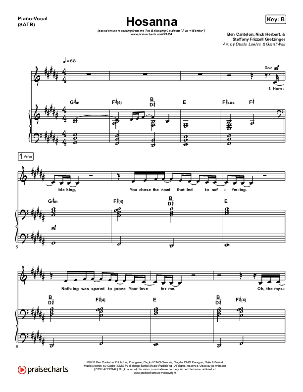 Download the sheet music for Hosanna by The Belonging Co / Kari Jobe, from the album Awe + Wonder. This song was arranged by Dustin Loehrs / Grant Wall in the key of B, Bb.