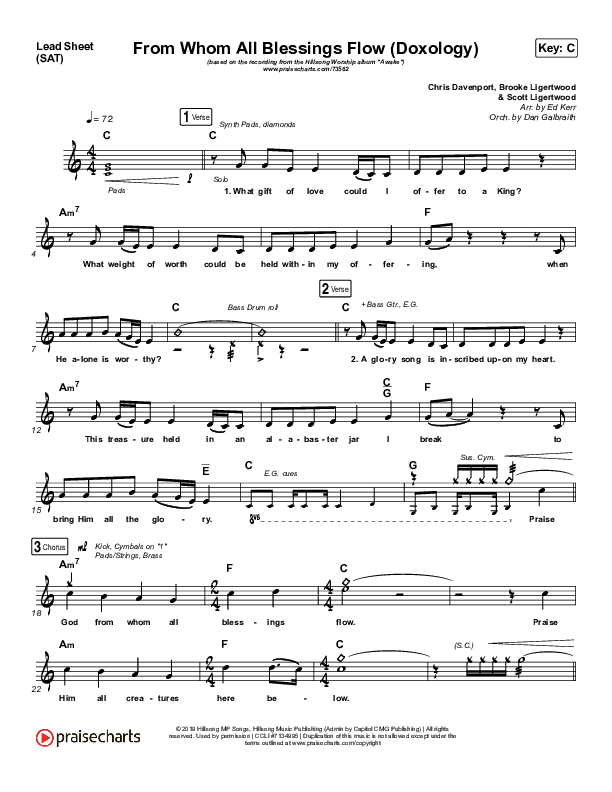 Download the sheet music for From Whom All Blessings Flow (Doxology) by Hillsong Worship, from the album Awake (Deluxe). This song was arranged by Ed Kerr / Daniel Galbraith in the key of Bb, C, Eb.