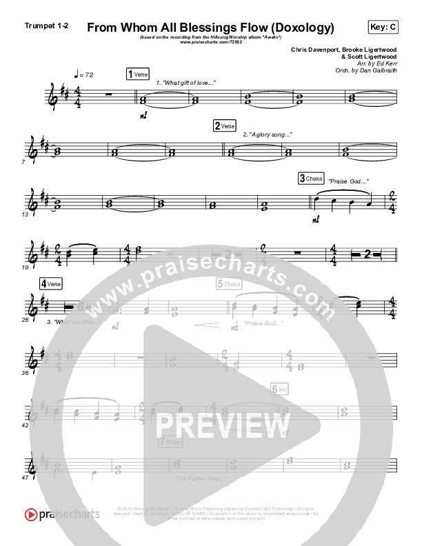 Download the trumpet sheet music for From Whom All Blessings Flow (Doxology) by Hillsong Worship, from the album Awake (Deluxe). This song was arranged by Ed Kerr / Daniel Galbraith in the key of Bb, C, Eb.