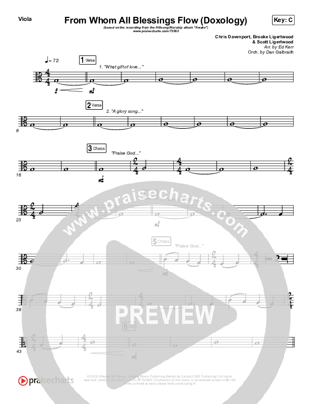 Download the Viola sheet music for From Whom All Blessings Flow (Doxology) by Hillsong Worship, from the album Awake (Deluxe). This song was arranged by Ed Kerr / Daniel Galbraith in the key of Bb, C, Eb.