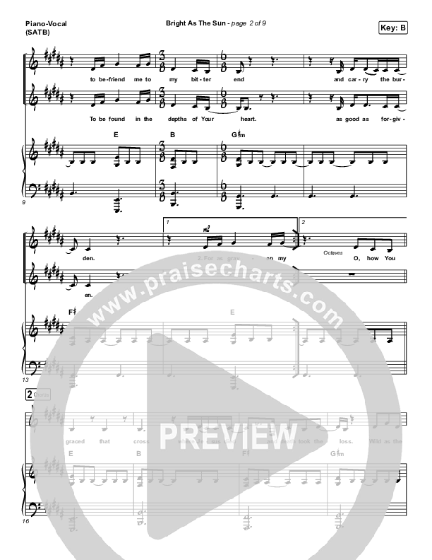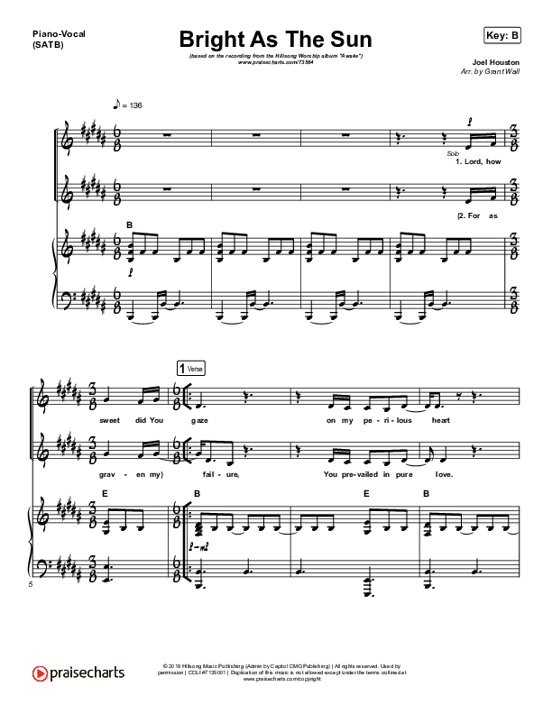 Download the sheet music for Bright As The Sun by Hillsong Worship, from the album Awake (Deluxe). This song was arranged by Grant Wall in the key of B, Bb.