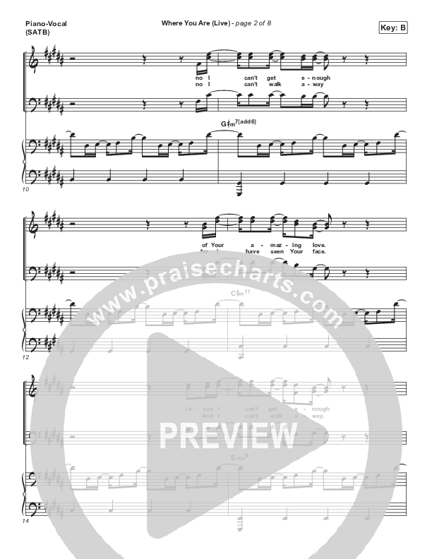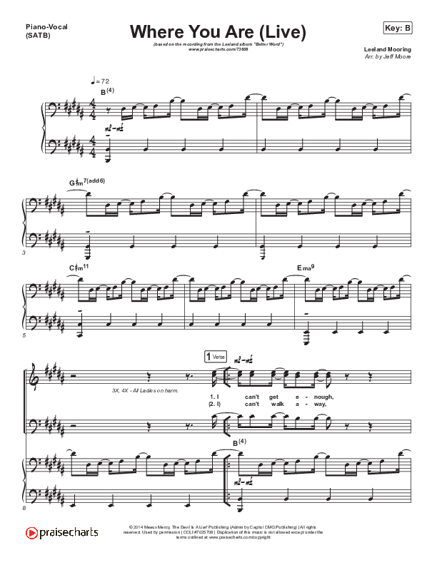 Download the sheet music for Where You Are (Live) by Leeland, from the album Better Word. This song was arranged by Jeff Moore in the key of B, C.