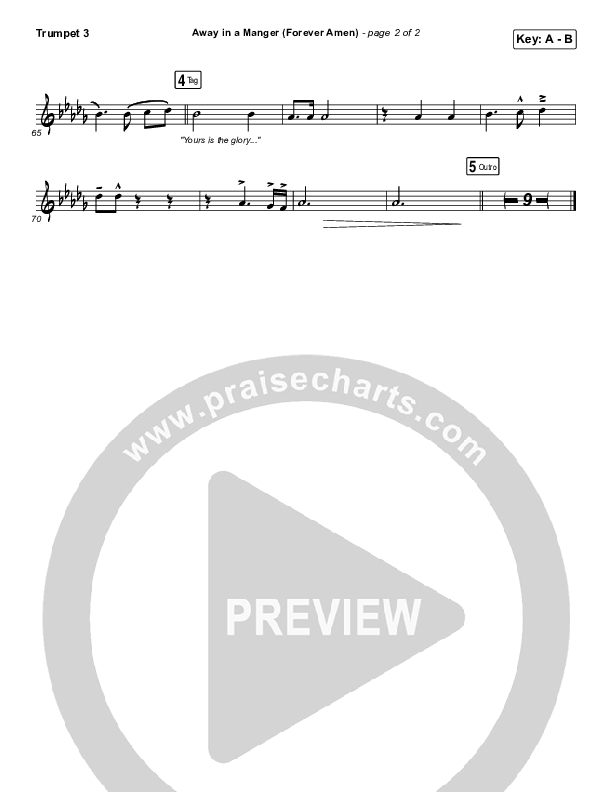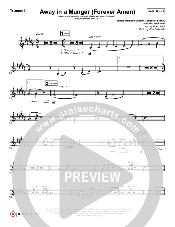 Download the Trumpet 3 sheet music for Away In A Manger (Forever Amen) by Phil Wickham, from the album Christmas. This song was arranged by Grant Wall / Daniel Galbraith in the key of A, Ab, C, G.