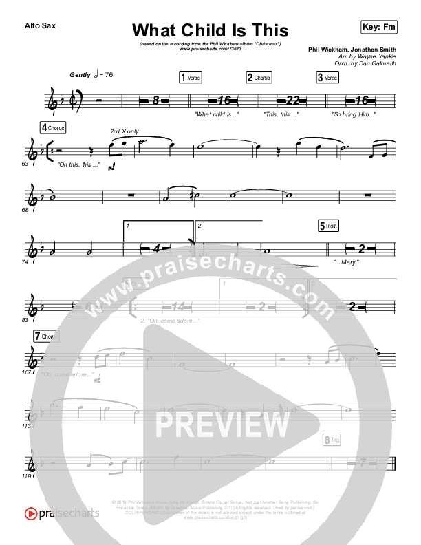 Download the AltoSax sheet music for What Child Is This by Phil Wickham, from the album Christmas. This song was arranged by Wayne Yankie / Daniel Galbraith in the key of Em, Fm.