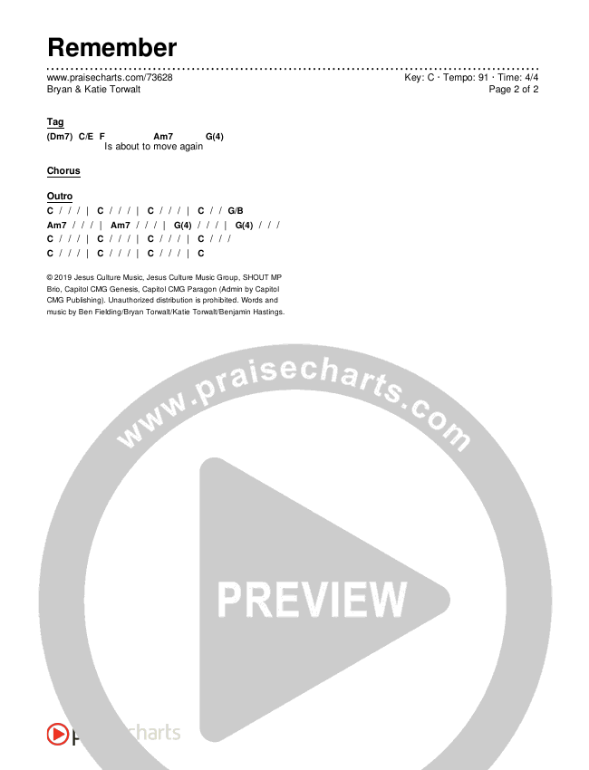 Download the PDF Chord Charts for Remember by Bryan & Katie Torwalt, from the album Remember - Single. This song was arranged by Ed Kerr / Grant Wall in the key of C, D.