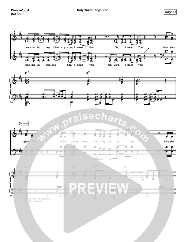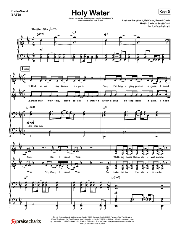 Download the sheet music for Holy Water by We The Kingdom, from the album Holy Water. This song was arranged by Daniel Galbraith in the key of C, D, Eb, F.