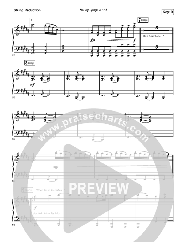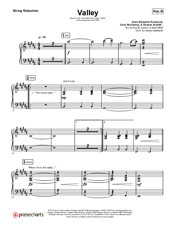 Download the String Reduction sheet music for Valley by Chris McClarney, from the album Fill This Place (Live). This song was arranged by Dustin Loehrs / Grant Wall / Daniel Galbraith in the key of B, Bb.