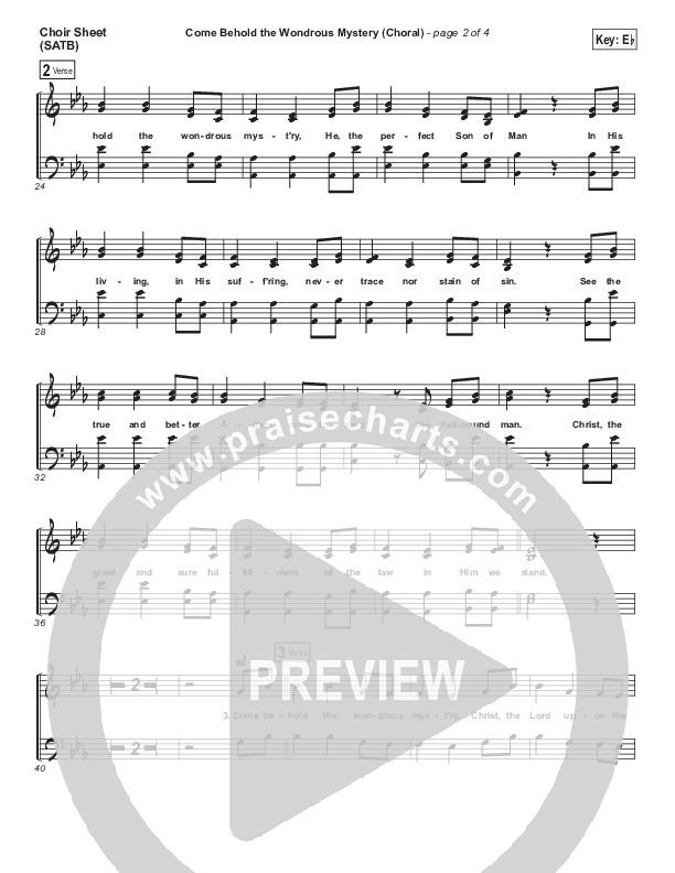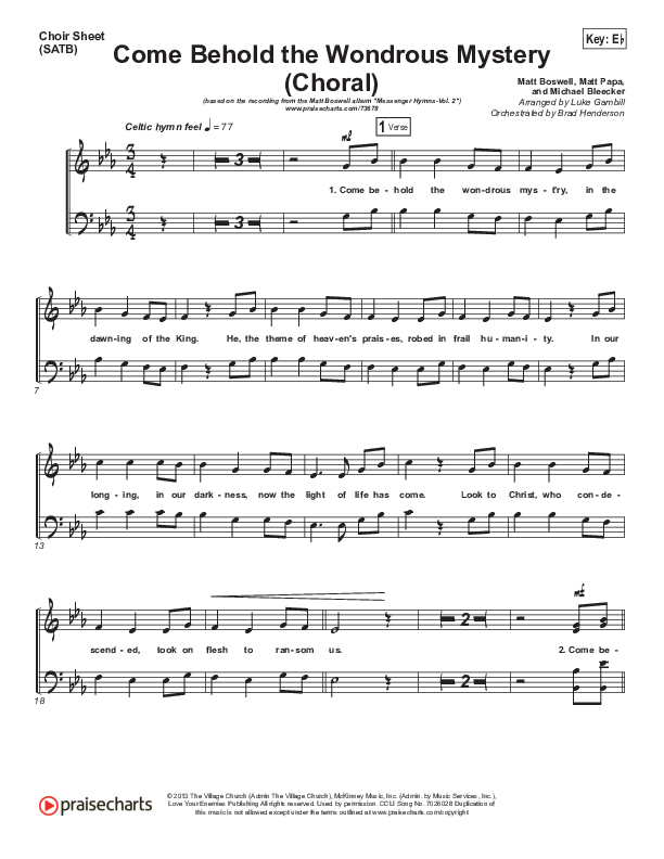 Download the Choir Sheet for Come Behold The Wondrous Mystery (Choral Anthem SATB) by Matt Boswell / Arr. Luke Gambill, from the album Messenger Hymns (Vol 2). This song was arranged by Luke Gambill / Daniel Galbraith in the key of Eb.