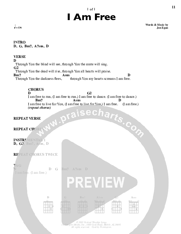 Download the PDF Chord Charts for I Am Free by Desperation Band, from the album Light Up The World. This song was arranged by Integrity Music in the key of D.