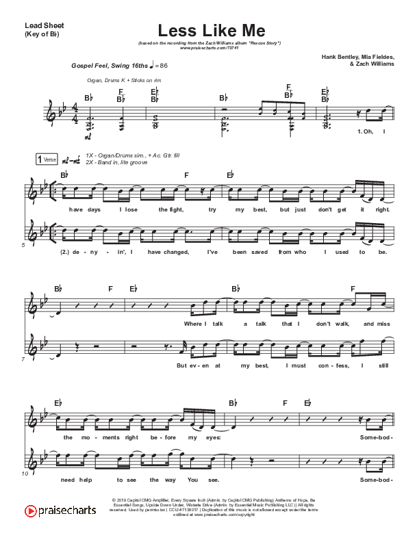 Download the sheet music for Less Like Me by Zach Williams, from the album Rescue Story. This song was arranged by Grant Wall / John Wasson in the key of A, Bb.