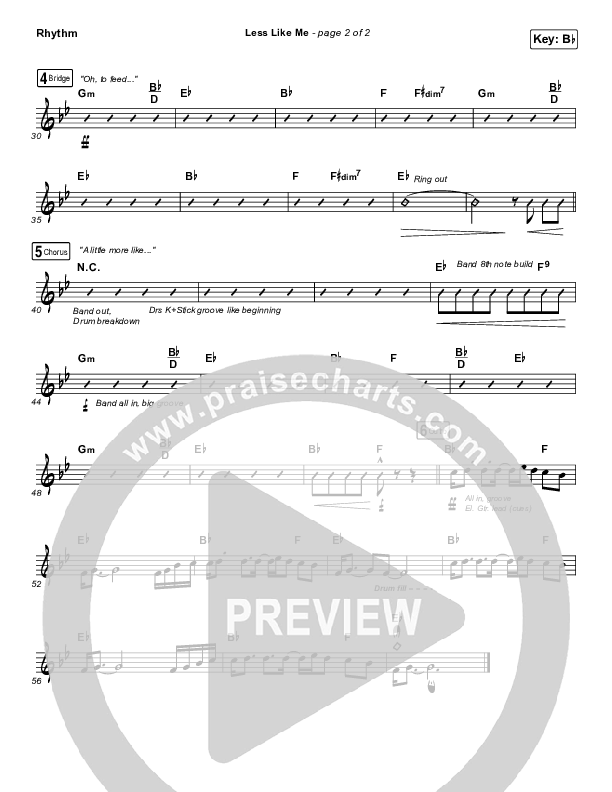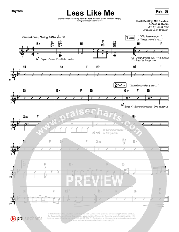 Download the Rhythm Chart for Less Like Me by Zach Williams, from the album Rescue Story. This song was arranged by Grant Wall / John Wasson in the key of A, Bb.