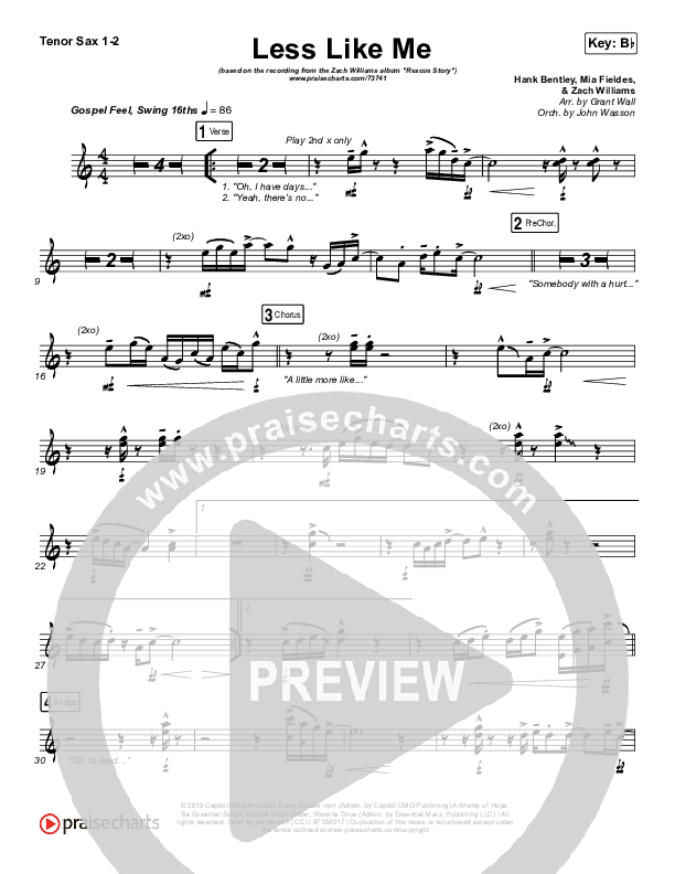 Download the Tenor Sax sheet music for Less Like Me by Zach Williams, from the album Rescue Story. This song was arranged by Grant Wall / John Wasson in the key of A, Bb.