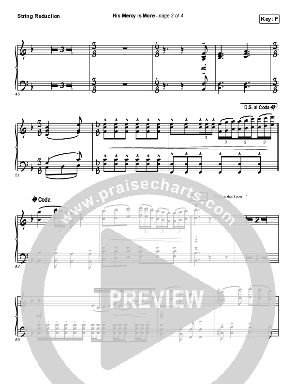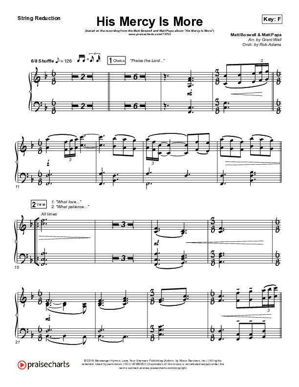 Download the String Reduction sheet music for His Mercy Is More by Matt Boswell / Matt Papa, from the album His Mercy Is More - The Hymns Of Matt Boswell And Matt Papa. This song was arranged by Grant Wall / Rob Adams in the key of E, F.